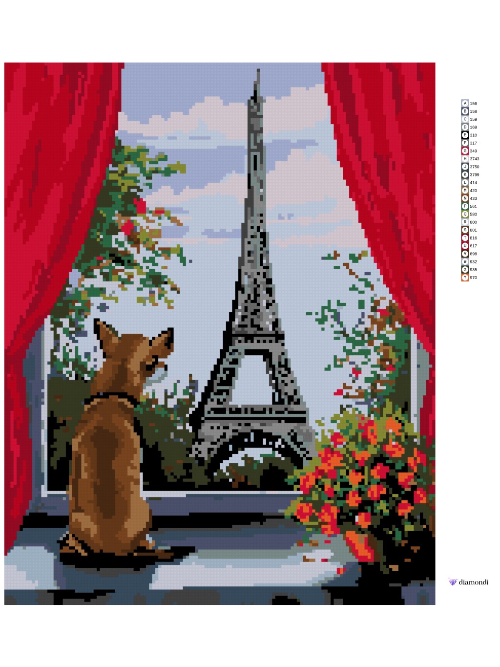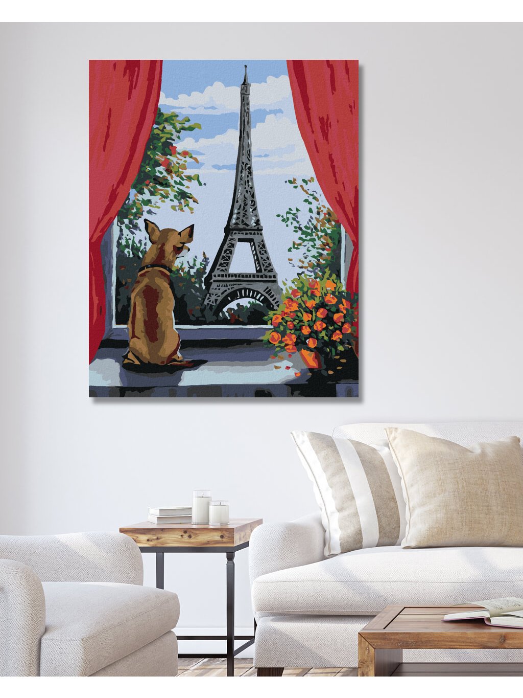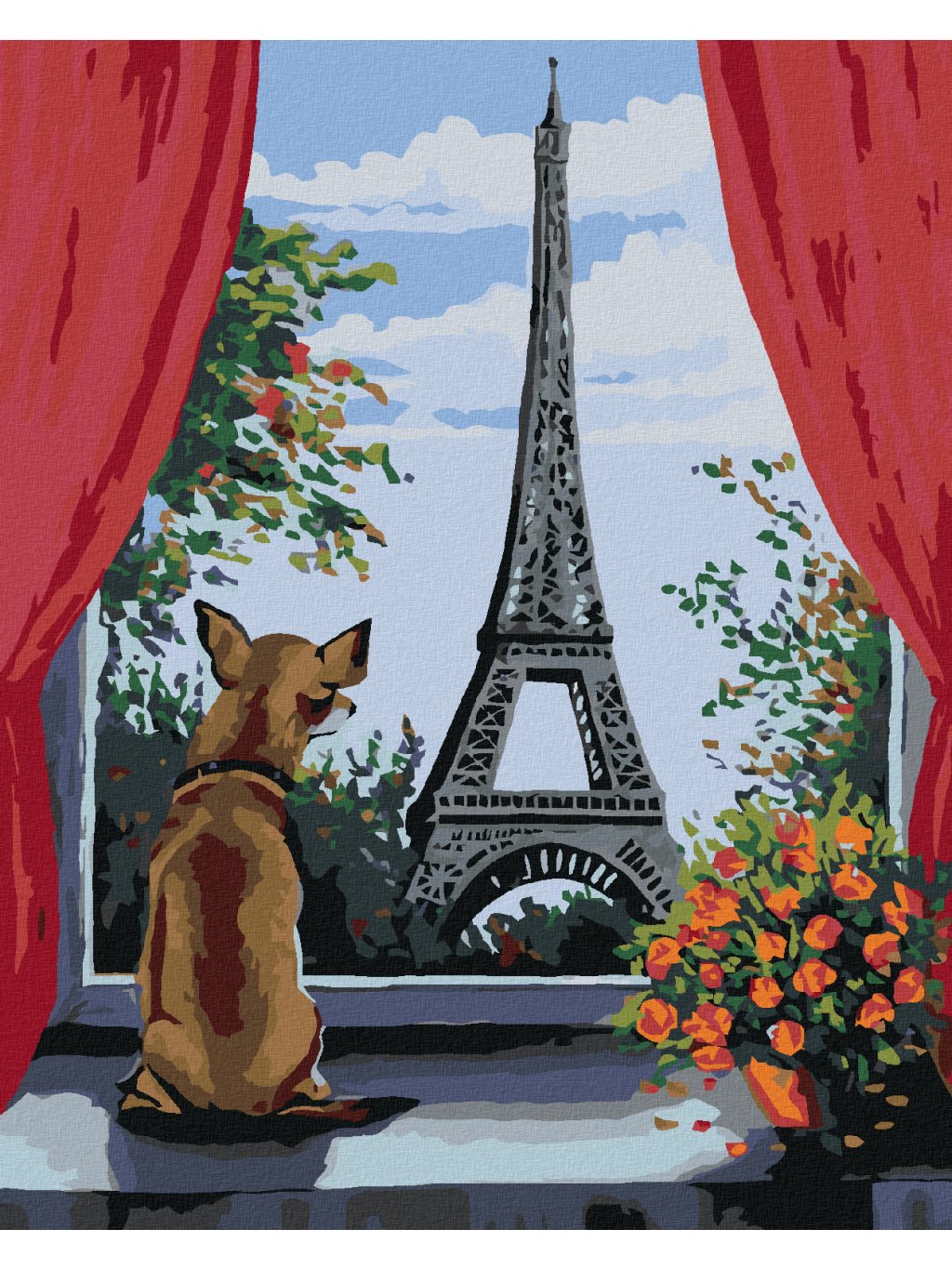 Diamantové malování - PEJSEK V OKNĚ A VÝHLED NA EIFFELOVKU