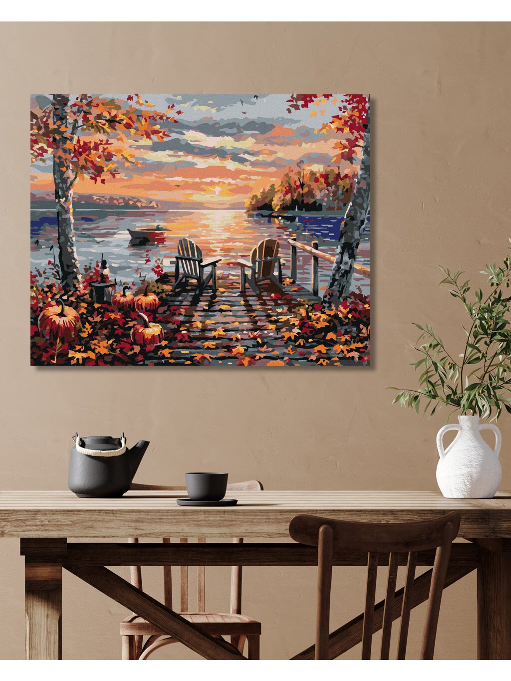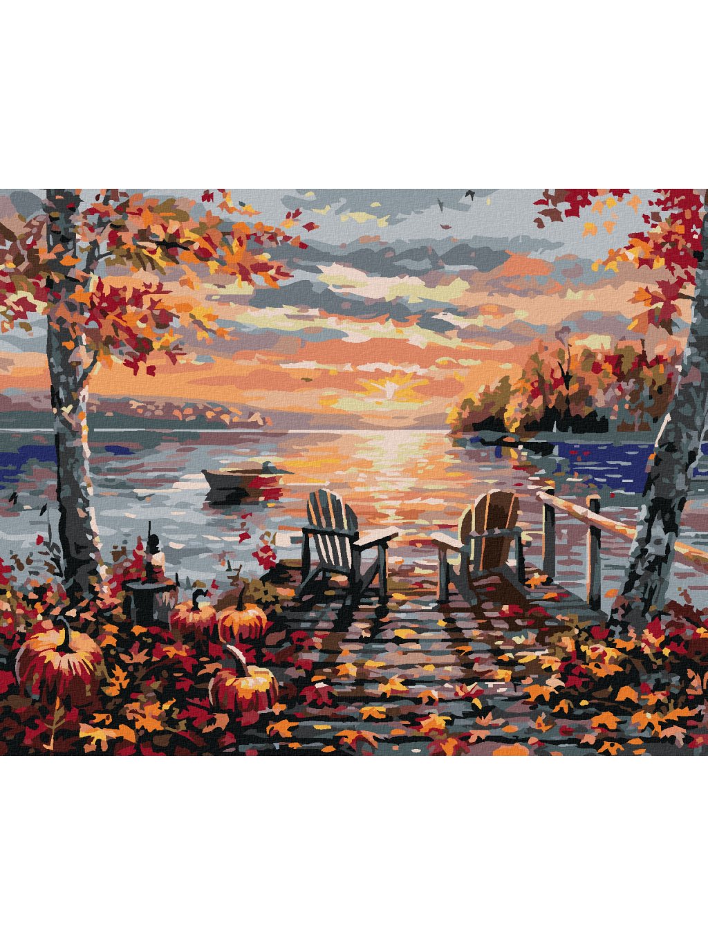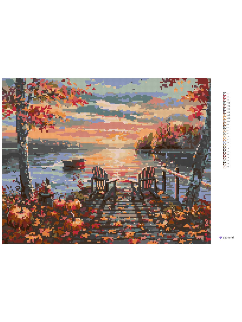 Diamantové malování - POSEZENÍ NA MOLE, ČLUN, PODZIMNÍ STROMY A ZÁPAD SLUNCE