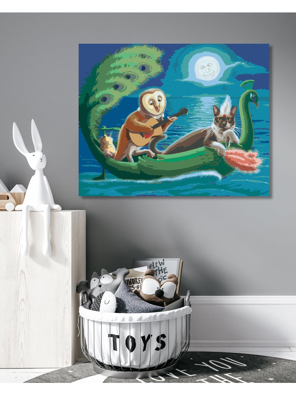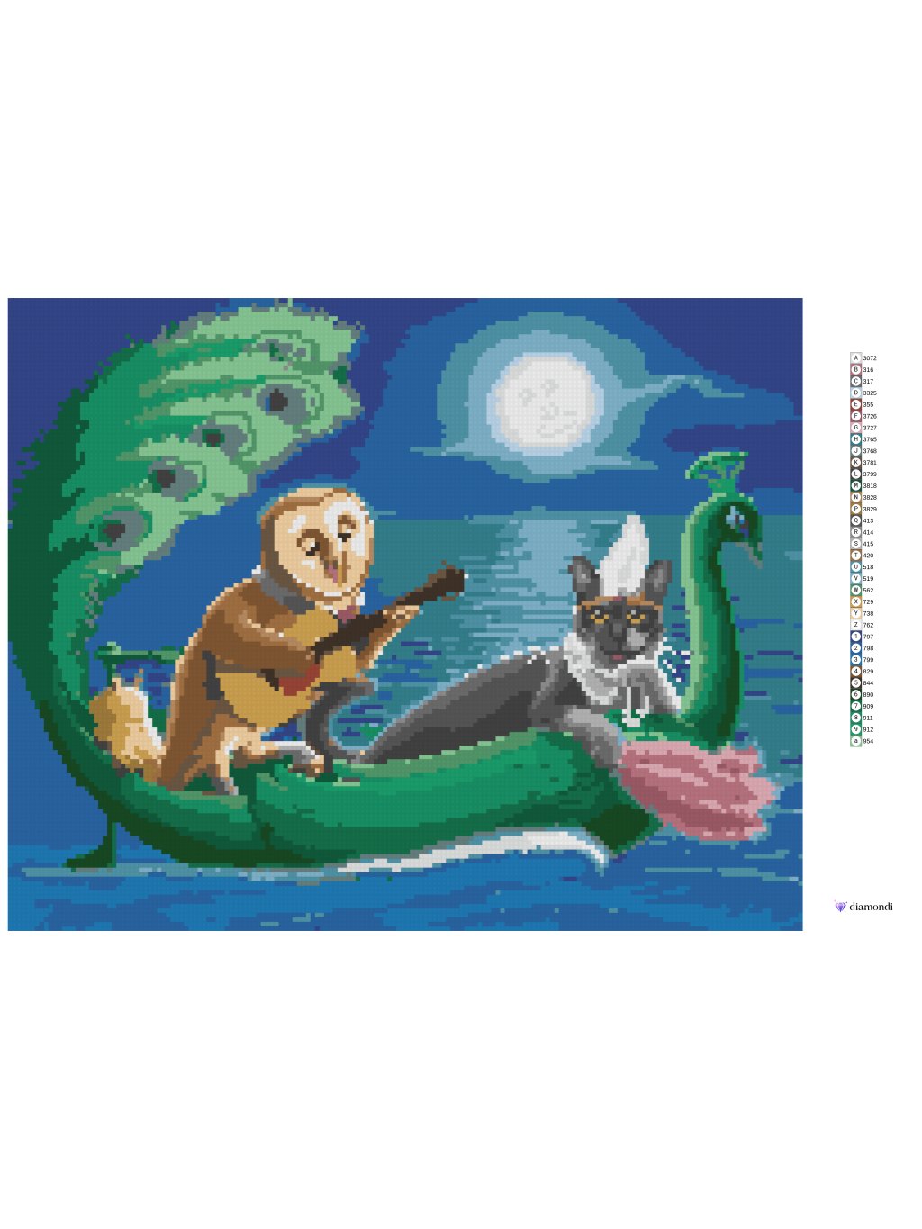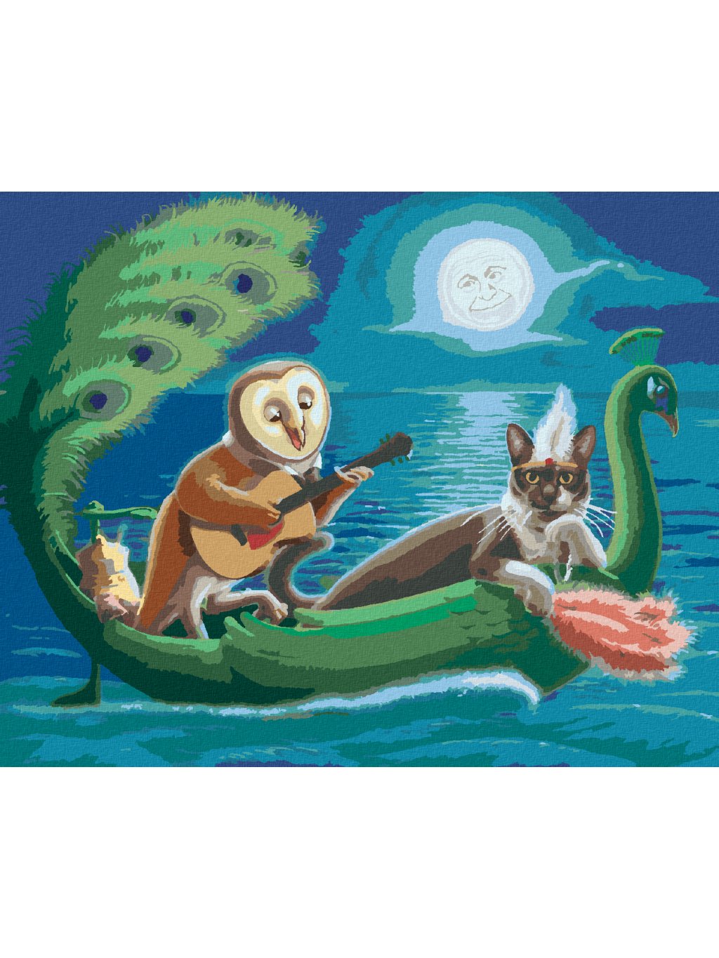 Diamantové malování - SOVA A KOČKA NA LODI VE TVARU PÁVA (SUE ELLEN BROWN)