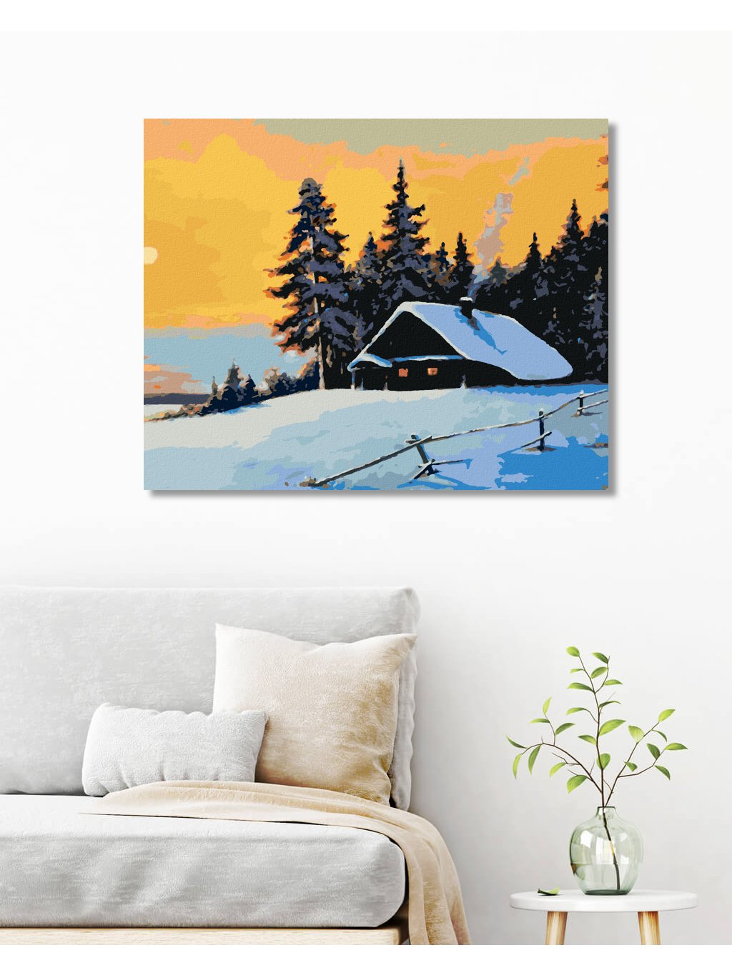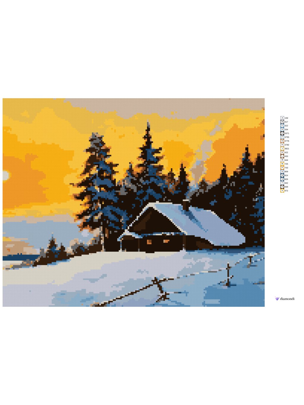 Diamantové malování - SRUB V ZIMNÍM LESE A ZÁPAD SLUNCE