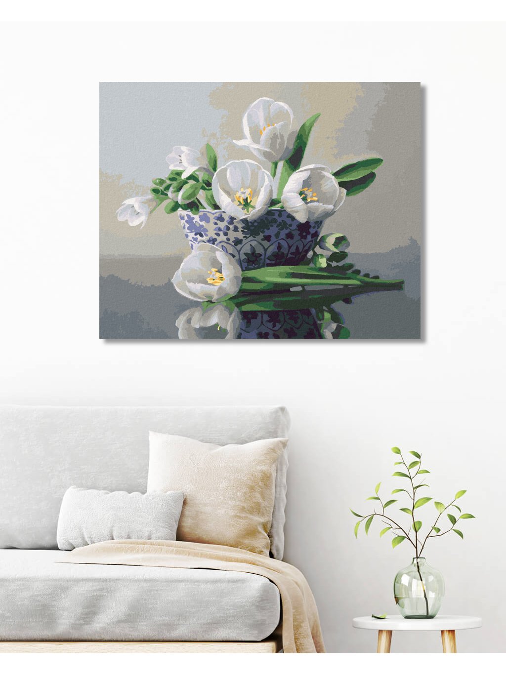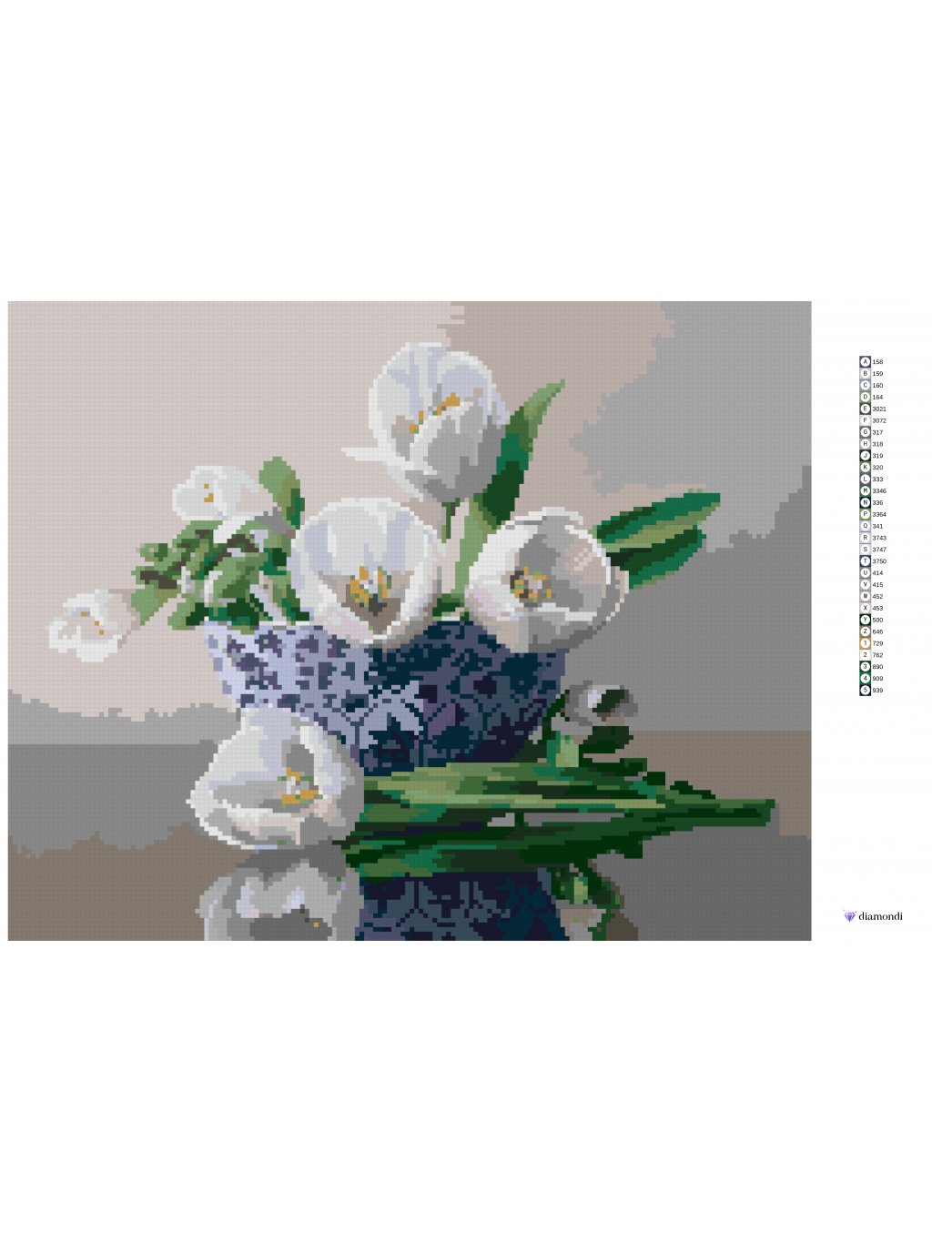 Diamantové malování - ZÁTIŠÍ BÍLÉ TULIPÁNY V MODROBÍLÉ MÍSE (PIETER WAGEMANS)