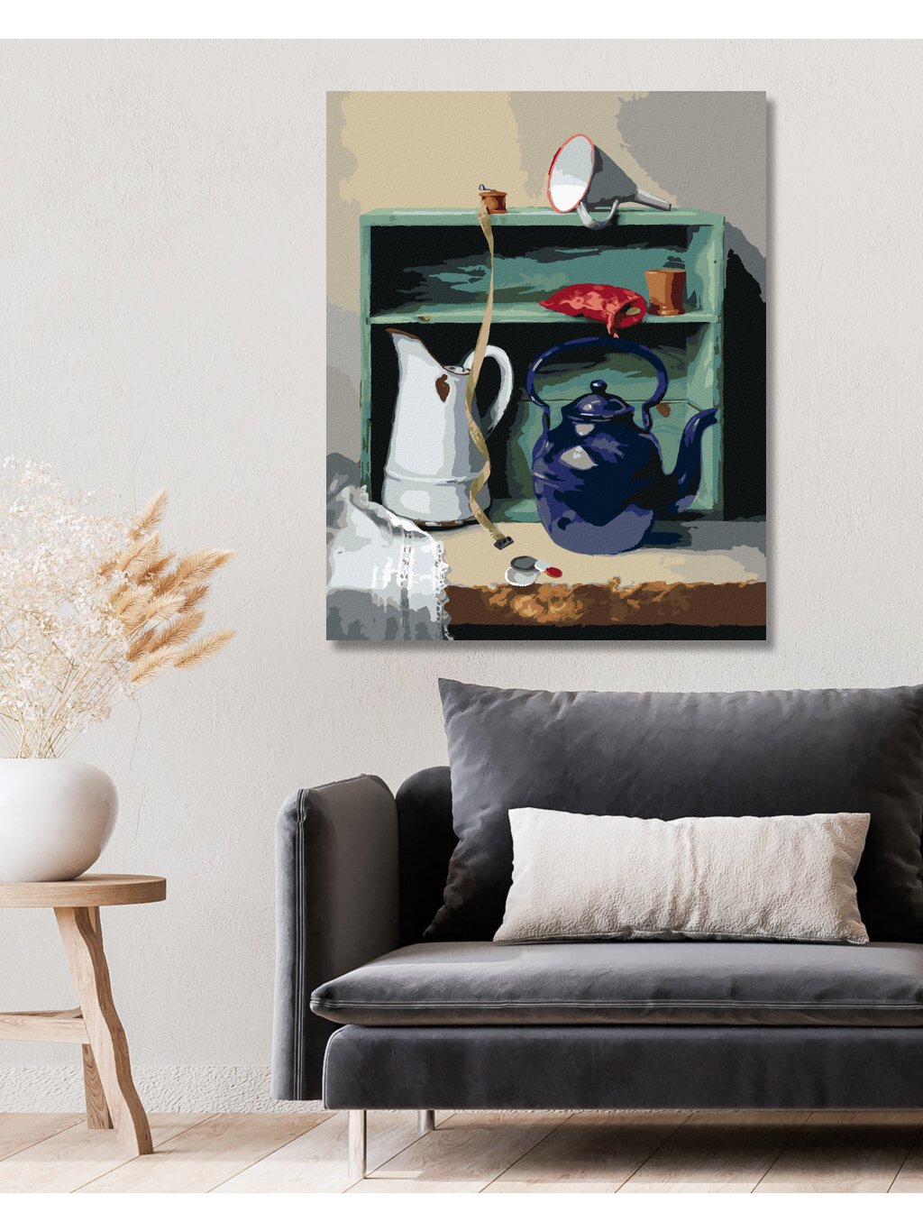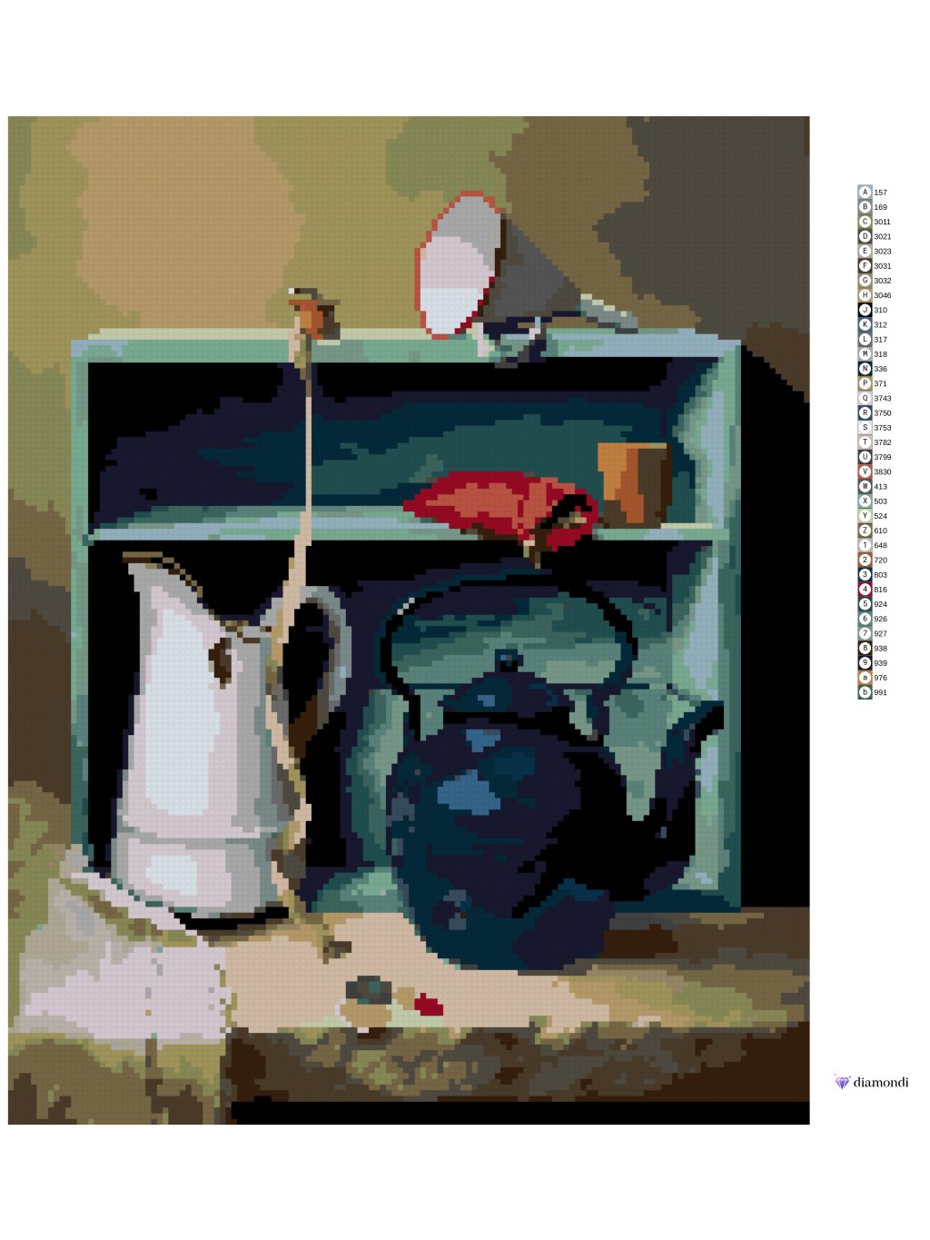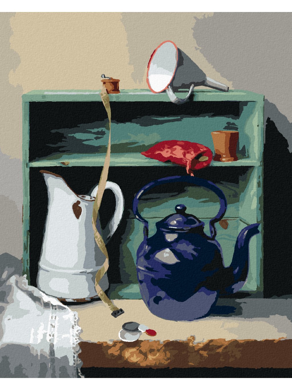 Diamantové malování - ZÁTIŠÍ KONVICE, KREJČOVSKÝ METR A SKŘÍŇ (PIETER WAGEMANS)