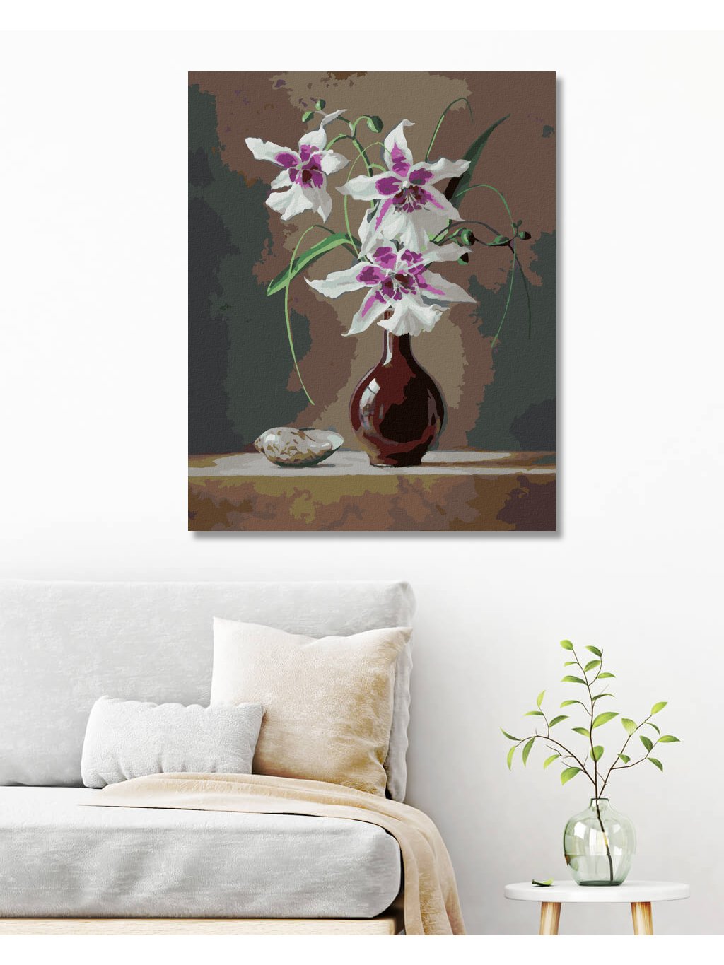 Diamantové malování - ZÁTIŠÍ ORCHIDEJ V ČERVENÉ VÁZE A MUŠLE (PIETER WAGEMANS)