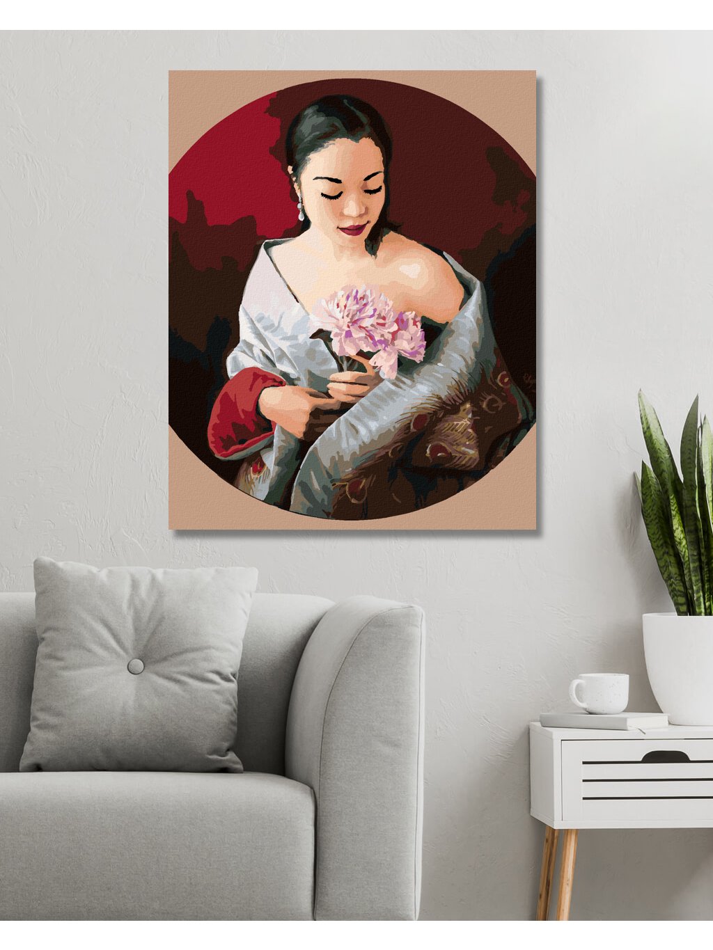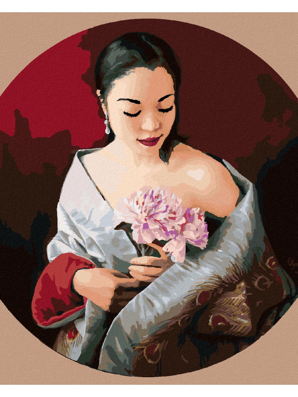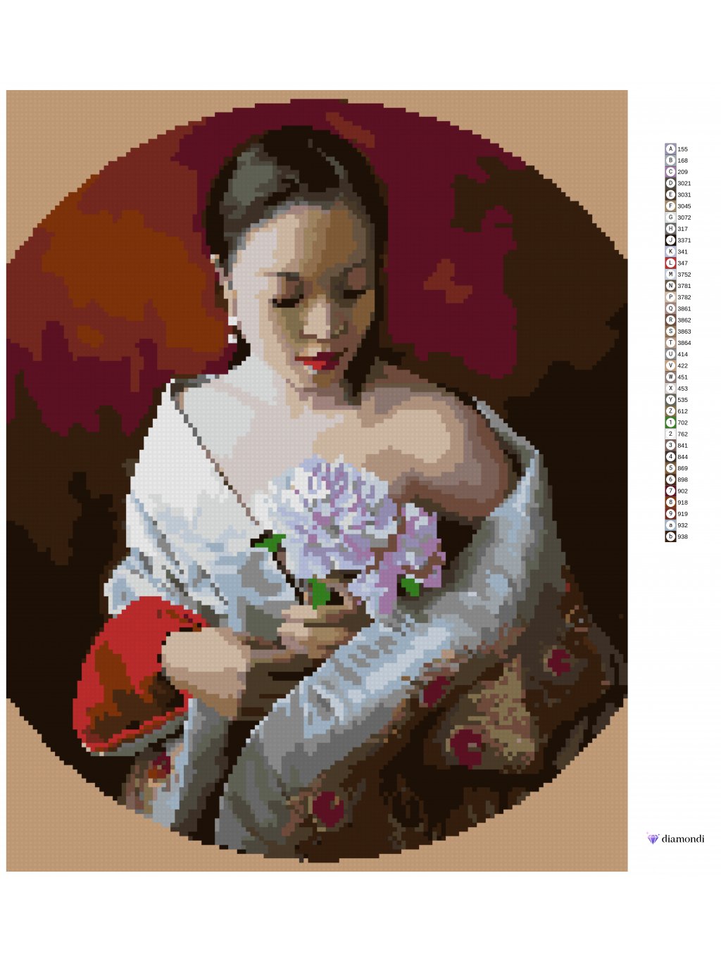 Diamantové malování - ŽENA V PŘEHOZU S PAVÍM VZOREM A KVĚTINA (PIETER WAGEMANS)